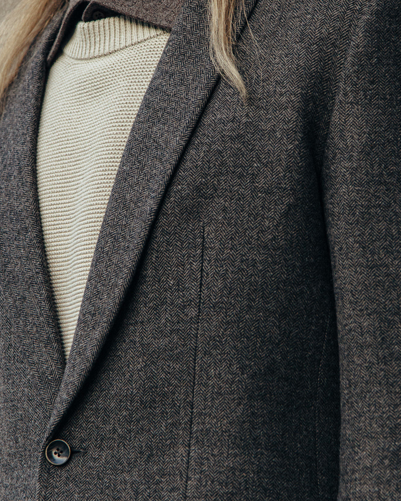 The classic herringbone weave adds depth and texture, while the structured shoulders and shawl lapel create a commanding yet effortless silhouette. This jacket is a true wardrobe cornerstone, designed to accompany you from spring to autumn.