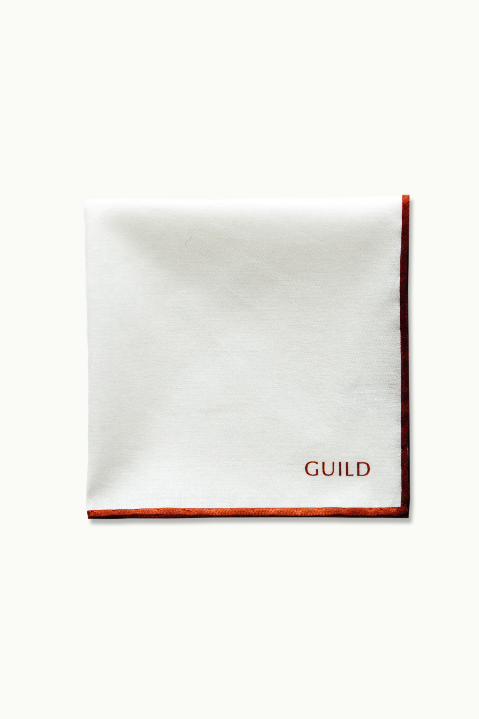 A crisp white cotton square trimmed with deep burgundy edges, ideal for adding a subtle hint of personality to smart-casual or summer tailoring. Its structured, matte finish works perfectly with linen suits, seersucker, or relaxed jackets, giving your look a sharp, masculine edge. The pocket square is handcrafted in Italy with hand-rolled edges.