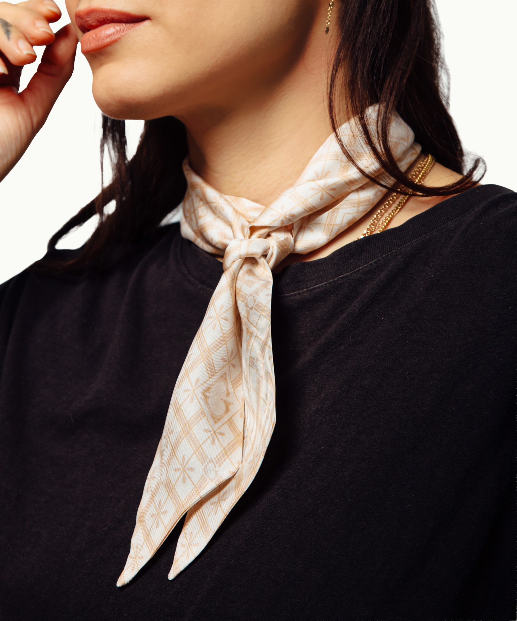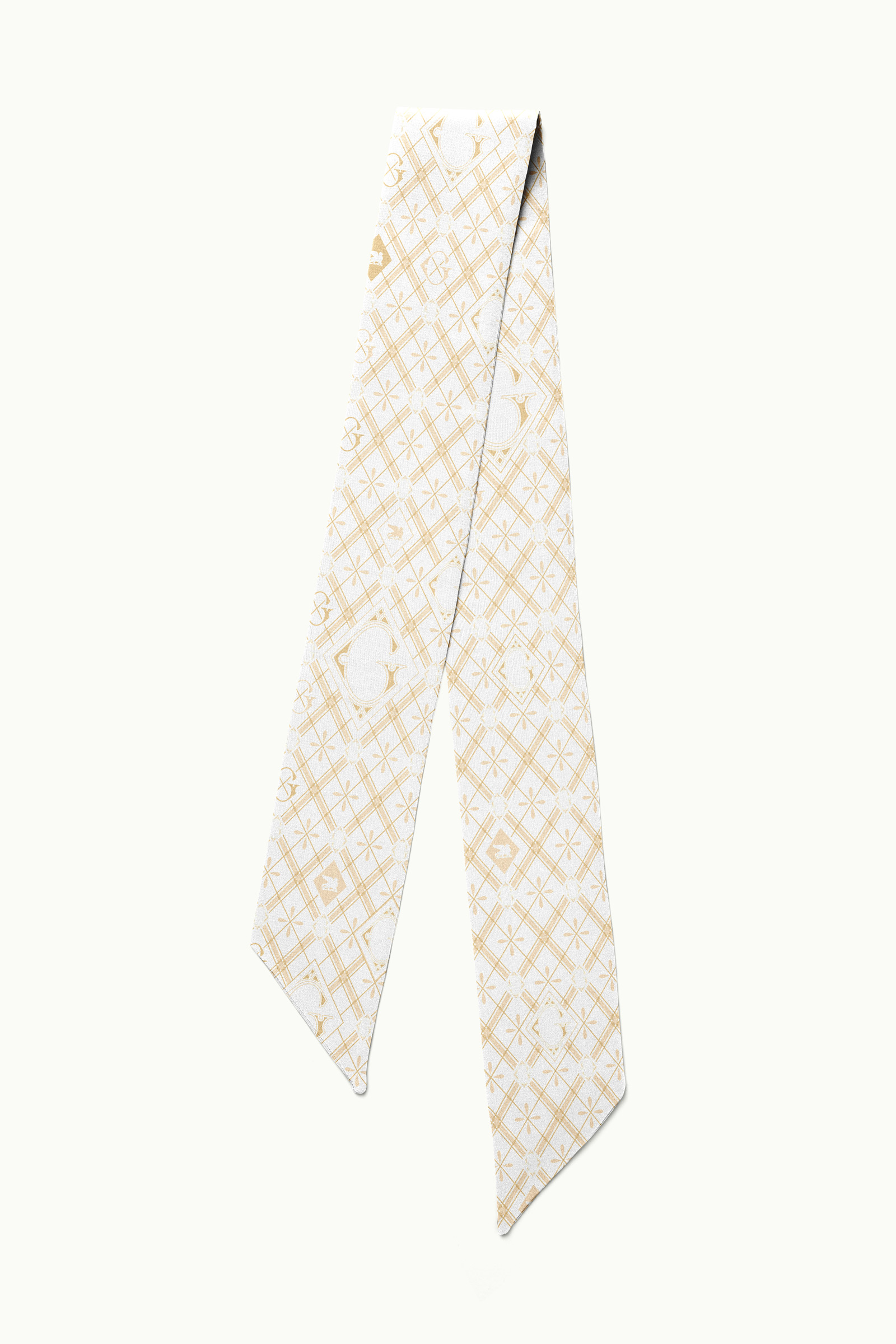 A luxurious ivory and gold silk-twill scarf with our signature motif. The soft, luminous tones evoke refinement and elegance, making it perfect to knot at the neck, tie around a ponytail, or loop over the handle of a tote for a sophisticated finishing touch.