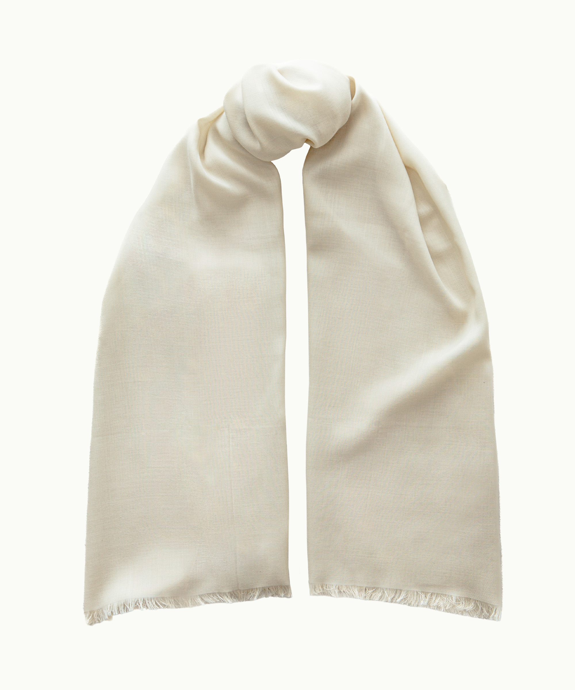 Soft, luminous ivory in luxurious silk-wool, handcrafted with Italian precision. Hand-rolled edges and fringing complete this versatile unisex scarf, ideal for cooler autumn and spring days or for layering in gentle winter weather. Effortlessly elevates both casual and formal looks.