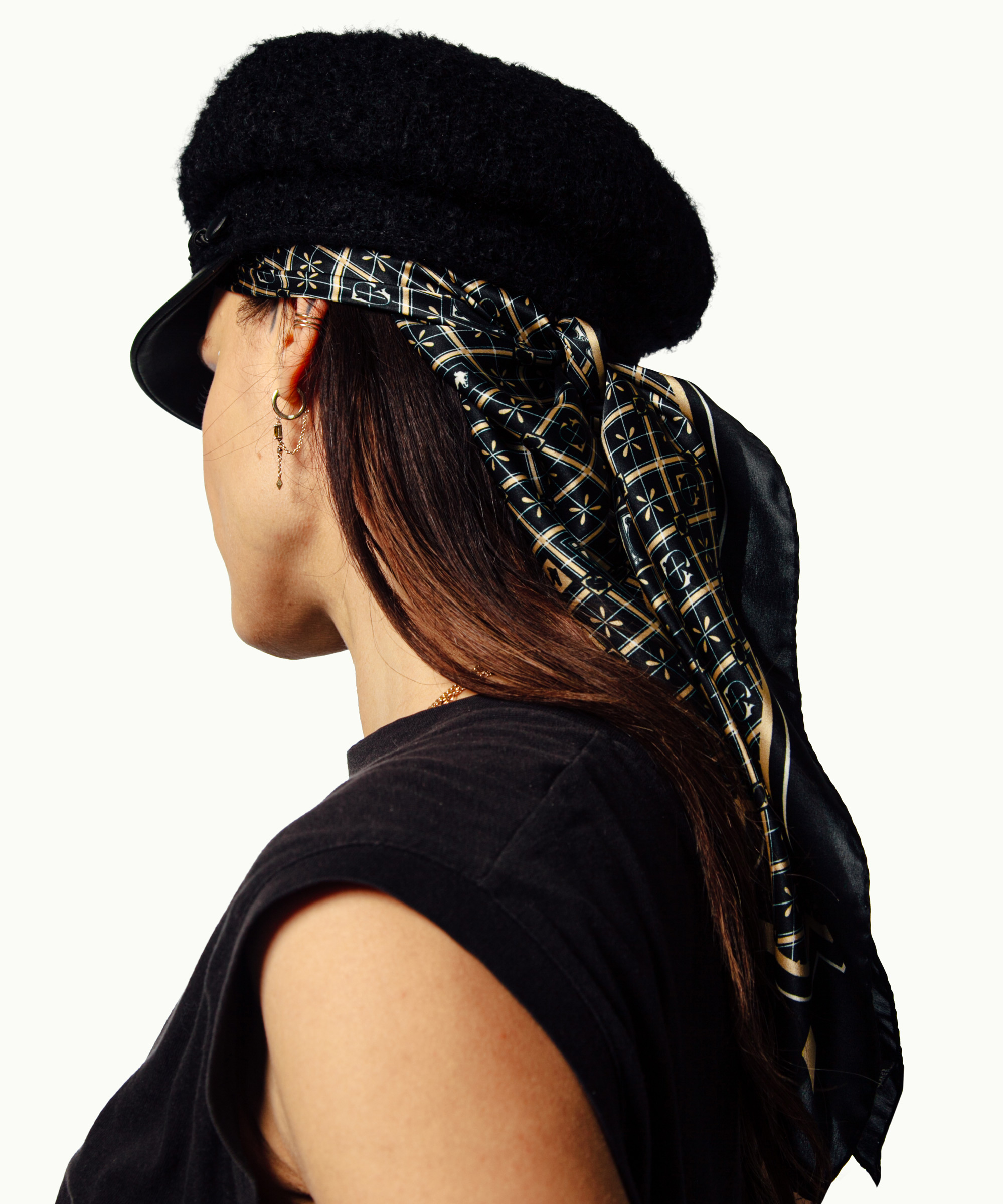 A unisex silk-satin scarf in rich black and golden tones. Our signature print brings a subtle whisper of heritage to modern wardrobes. Exceptionally versatile, it can be knotted as a gentleman’s cravat, draped elegantly around a lady’s neck, or worn as a refined head scarf.