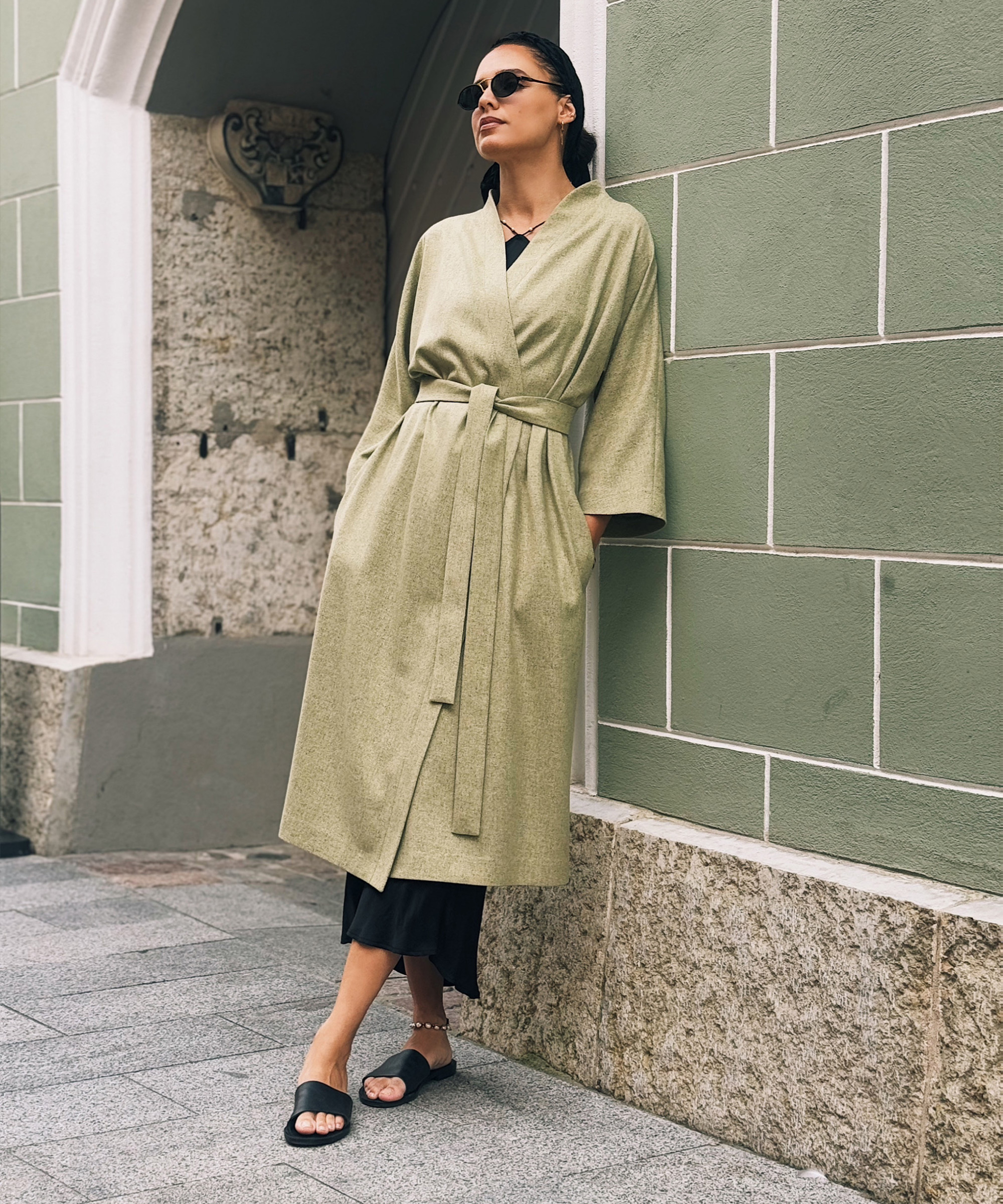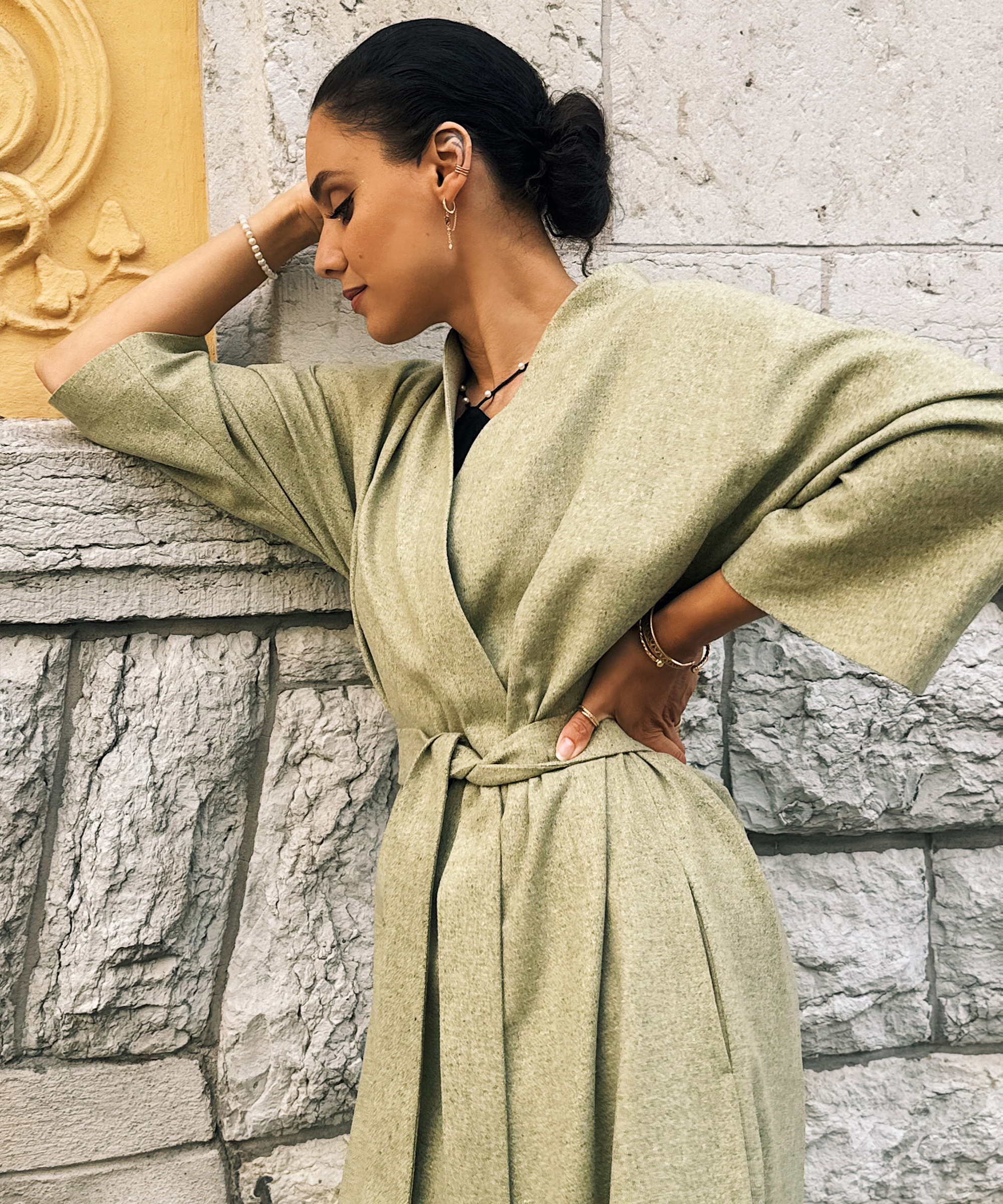 Our stunning signature kimono robe in a dreamy laurel green is perfect for any occasion. This robe is crafted from premium-quality, OEKO-TEX-certified silk and wool blend, making it ideal for summer months.